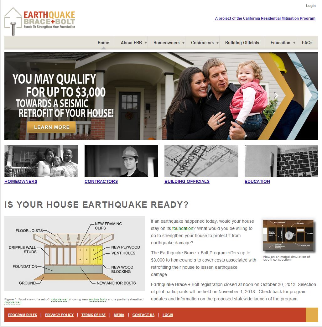 California Residential Mitigation Program had an interesting problem: Launching a statewide program providing funds to homeowners to retrofit their house to lessen earthquake damage. And, the Web site must assist the small staff be more productive and drive the required collaboration between the homeowners and the organization – from practically any type of device. Etchasoft was selected as the development and support partner and provided the Web development expertise in defining the application lifecycle, translating that process into an online Web application, developing a homeowner relationship management system and launching the core Web site on a flexible content management system in a responsive design that can adjust to the size of the device accessing the site.